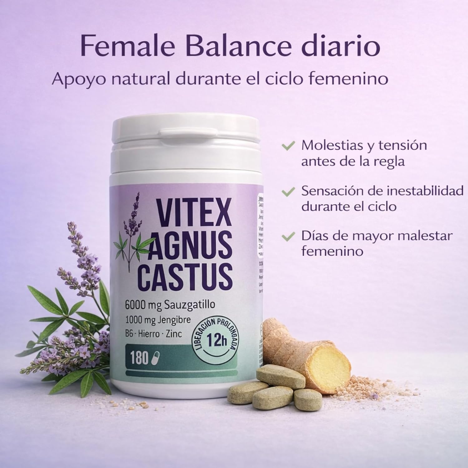- APOYO AL FEMALE BALANCE Diseñado para mujeres que buscan equilibrio y estabilidad a lo largo del ciclo. Combina vitex cápsulas, vitamina B6, zinc e hierro para apoyar el confort y el bienestar femenino de forma natural.